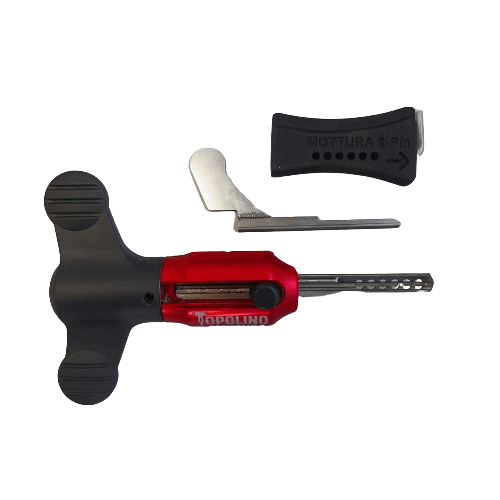 Important : Cet outil ne doit être utilisé que sur les cylindres de serrure Mottura Project 6 broches. Il est conçu avec une structure spécifique correspondant uniquement à ces serrures. Le décodeur Topolino se compose d'une lame avec 6 broches disposées dans un ordre spécifique. Ne serrez pas ou ne manipulez pas les boulons, cela pourrait nuire aux capacités d'ouverture de l'outil.